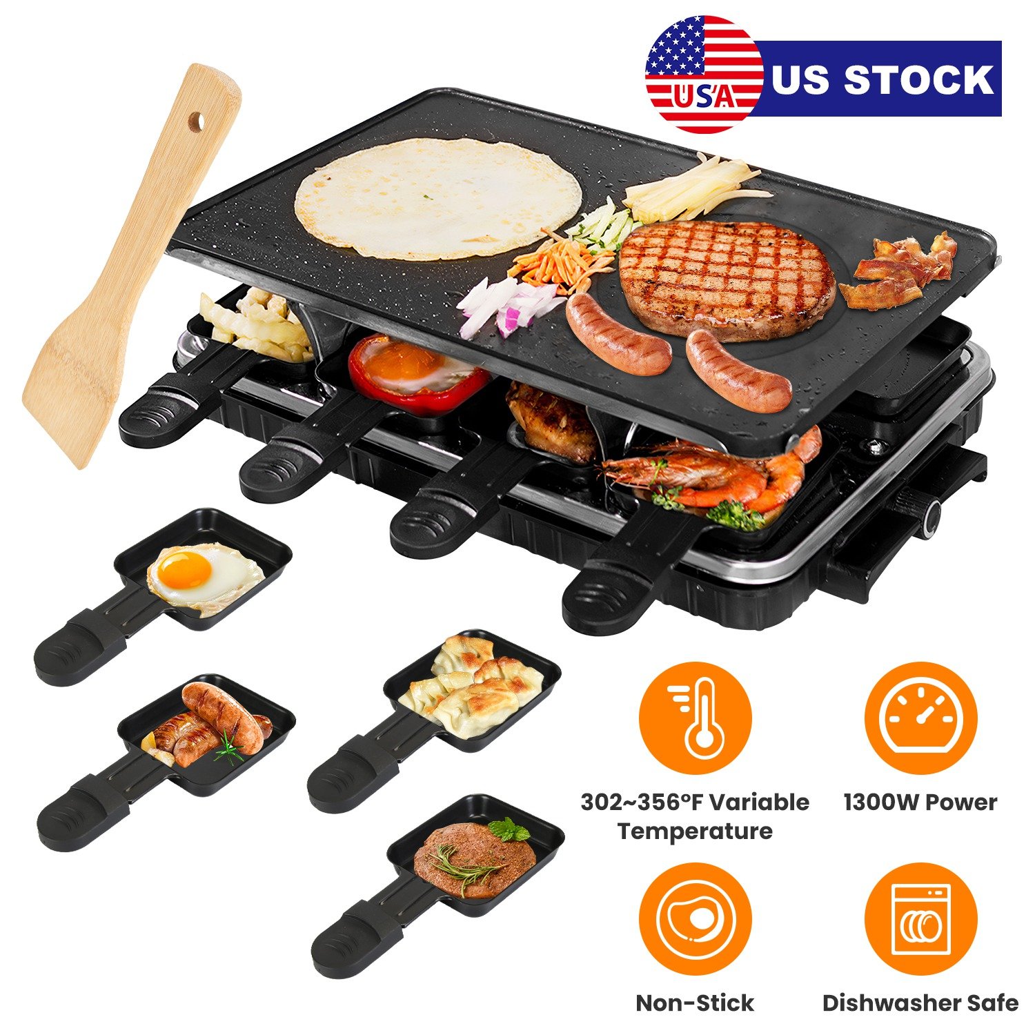 1300W Raclette Desktop Grill for 8People Non-Stick Reversible Electric Indoor Griddle with 8 Cheese Melt Pans Adjustable Temperature Dishwasher Safe K