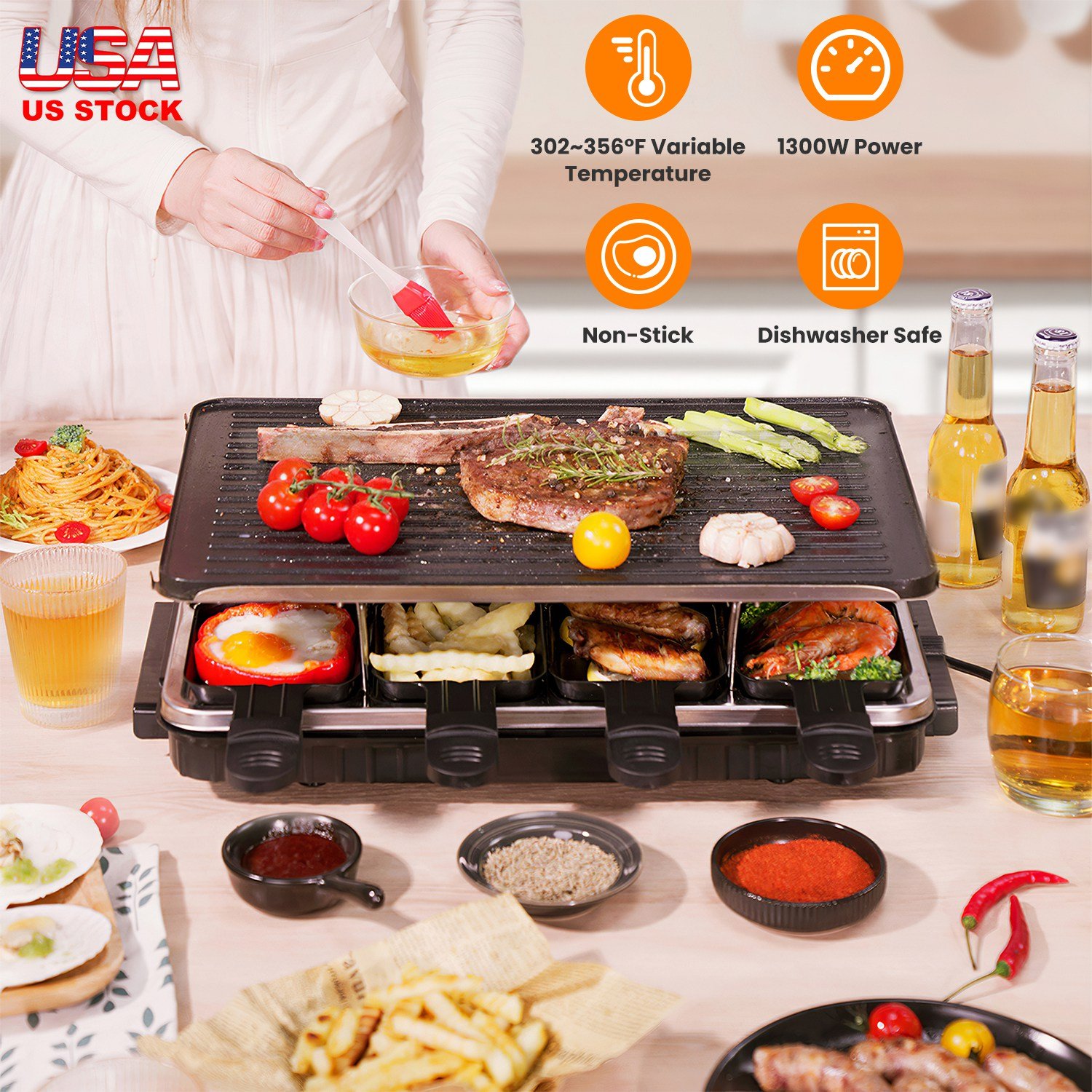 Perfect for gatherings, parties, or cozy family nights, our electric griddle is an ideal choice for preparing a variety of foods including meats, seafood, vegetables, eggs, crepes, and pancakes. Non-stick large grilling plate with dual sides, grooved side for achieving coveted grill marks on meats while flat surface for creating smooth crepes. The 1300W power ensures quick and even heating, and variable temperature adjustment for precise control to avoid burnt or undercooked food. Come with 8 individual raclette pans, your guests can melt rich cheese while grilling meat on the grill surface.