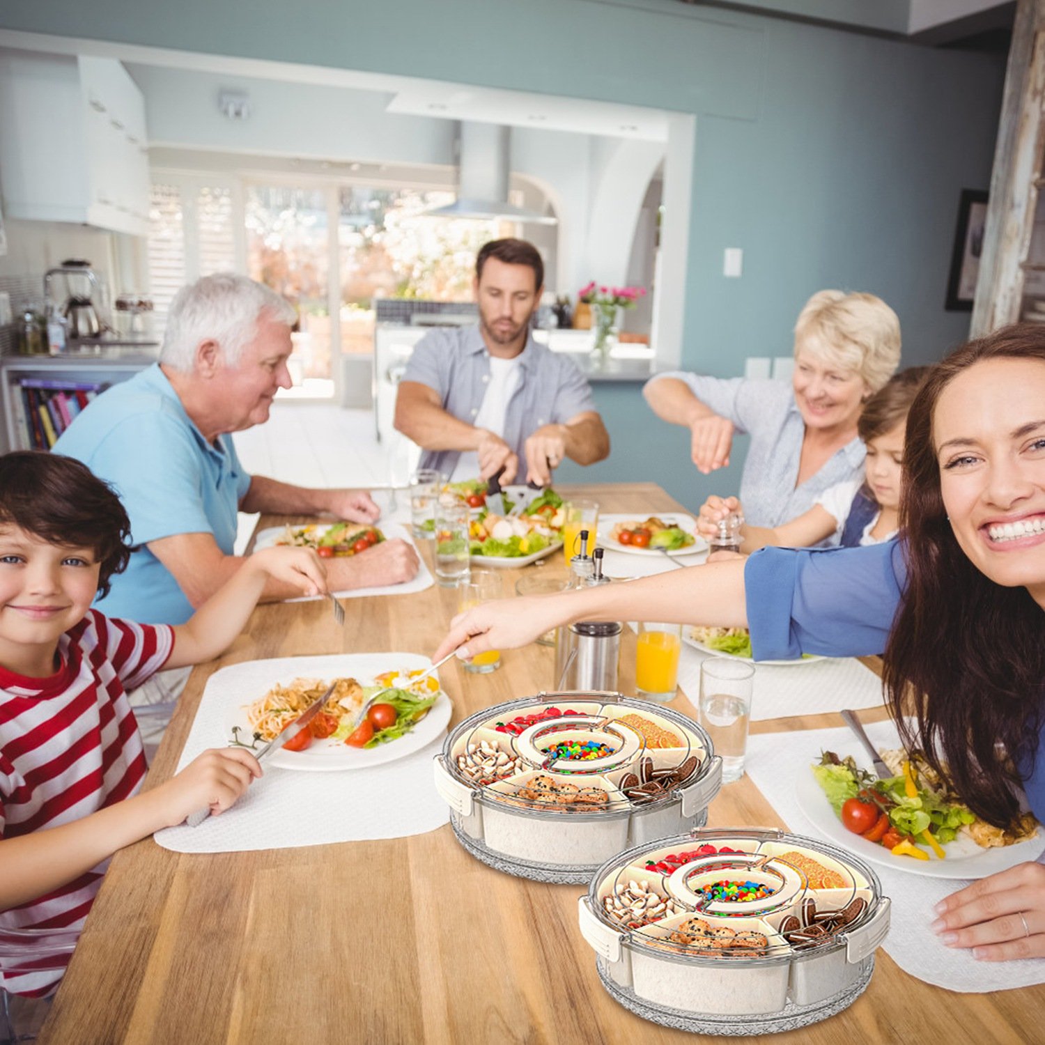 Perfect for storing snacks, fruits, nuts, candies, and even salads, our divided serving tray is designed to keep your snacks and fruits neatly sorted while preventing any unwanted mixing of flavors. Sealed lid with silicone circle and secure latches helps maintain freshness and cleanliness of food. And hidden handle ensures convenient portability wherever you go. 360° rotatable base makes serving yourself and your guests much easier than ever before. Whether you\'re camping, hosting a party, enjoying a picnic, or having a family movie night, our divided snack box containers is your best choice!