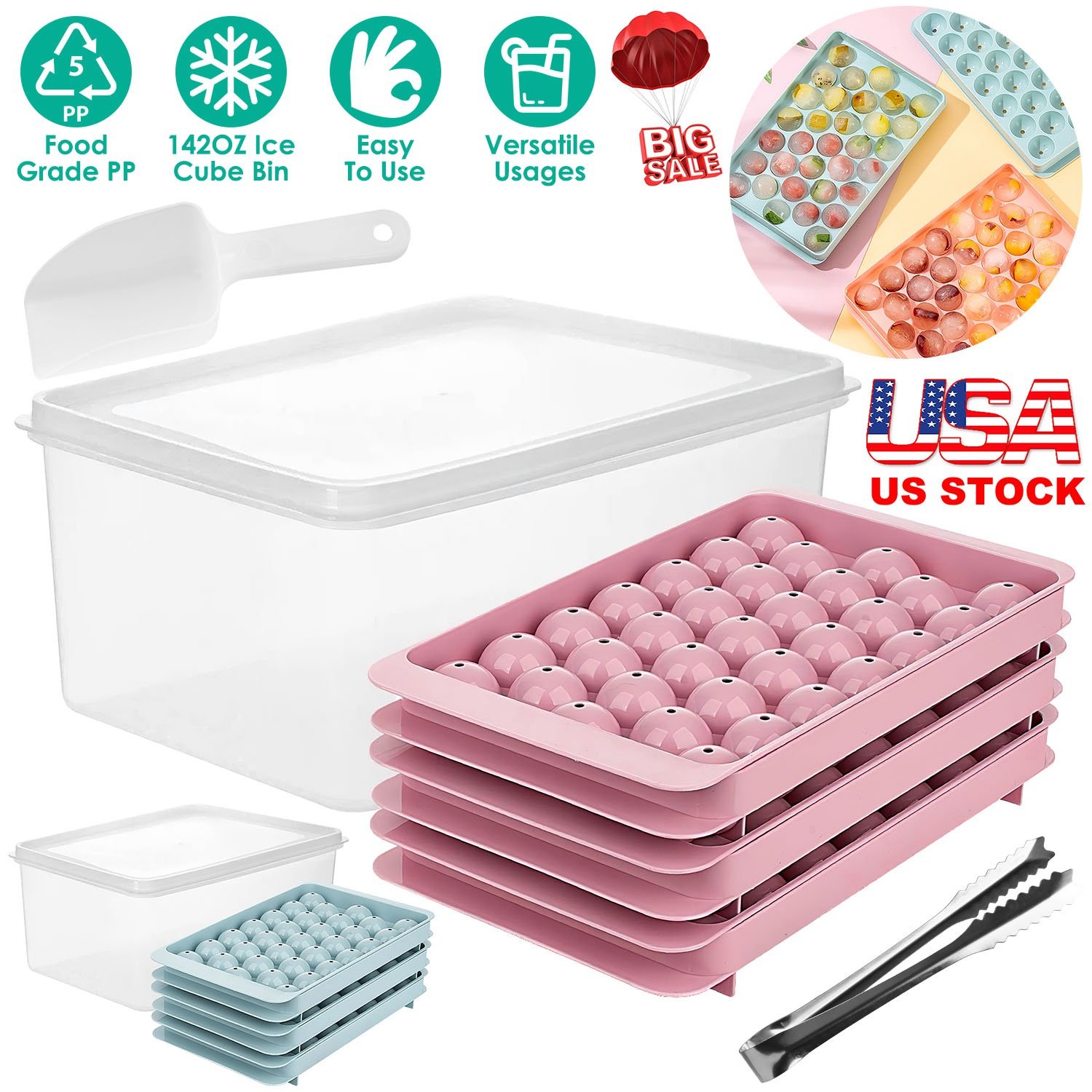 Do you like icy beverage and want to enjoy ice drinks anytime anywhere? Our 4 packs ice cube trays make ice small and fun, which is an easy and effective tool to get the ice balls in a short time than other standard ice trays. Food grade PP material makes it safe, non-toxic and durable for a long time use. With 4 trays and an ice cube container, you can make 132Pcs ice balls at one time and store about 400pcs ice balls in the ice bin to DIY your desired drink anytime with included ice scoop and ice tong.